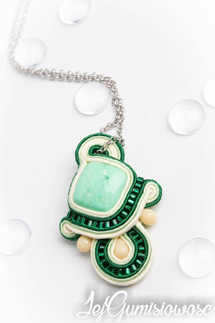 5. Niebiesko - zielony. Dość ciężka kolorystyka, aczkolwiek bardzo wpadła mi w oko. W centrum chryzokola, dodatkowo użyłam koralików Togo oraz howlitowych kuleczek. 6 x 3,8 cm (długość z krawatką)